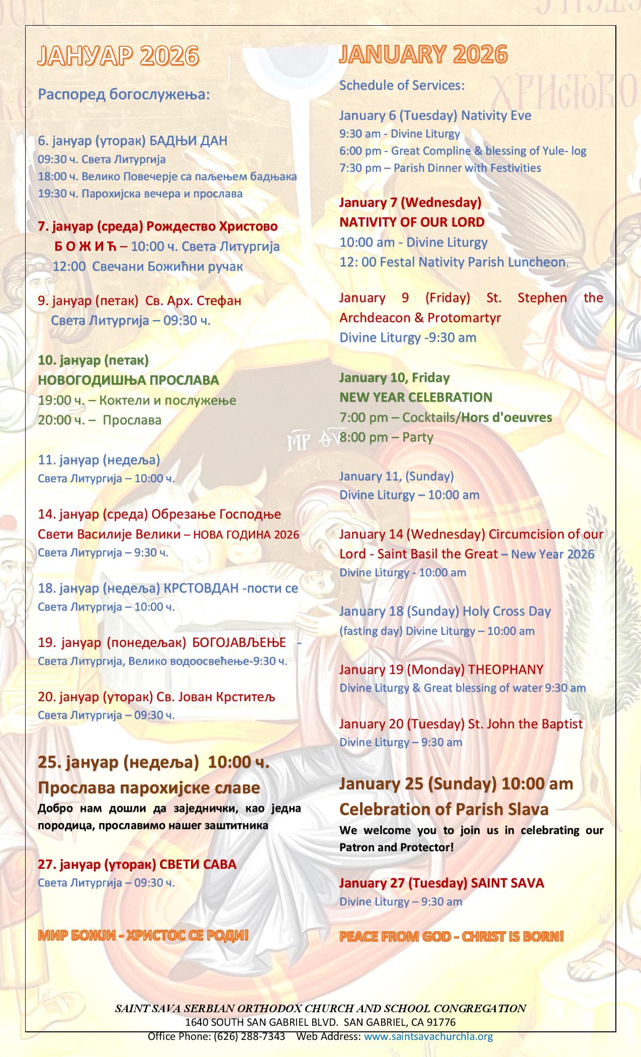 Located in San Gabriel, CA, our church is a parish of The Western American Diocese of The Serbian Orthodox Church, under spiritual leadership of His Grace Bishop Maxim. Our Parish was founded in 1909 by our ancestors who immigrated from Balkan and settled in the Southern California. The Divine Services are in Serbian, English and Church-Slavonic.